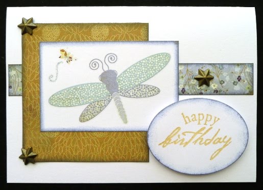 I am still completely in love with Basic Grey's Wisteria collection, although my 6"x6" pack and rub-ons are getting low - now that's the sign of a good collection. Basic Grey Challenges want us to use blue, gold and white this week, Simon Says Challenge are asking for "things with wings", A Spoon Full of Sugar suggest 3D, and I've used Cute Card Thursday's sketch:
